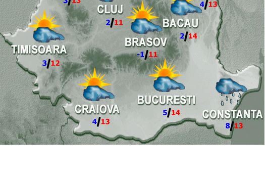 Temperaturile maxime se vor încadra între 8 şi 17 grade, cu cele mai ridicate valori în Câmpia de Vest; minimele termice vor fi cuprinse 1 şi 11 grade. Izolat vor fi condiţii de ceaţă şi, mai ales în nord şi centru, se va produce brumă.