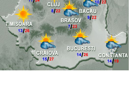 Temperaturile maxime vor fi cuprinse între 19 grade în nordul Moldovei şi pe litoral şi 28 de grade în sudul Olteniei, iar cele minime se vor încadra între 6 şi 16 grade, mai coborâte în depresiunile Carpaţilor Orientali până spre 3 grade.