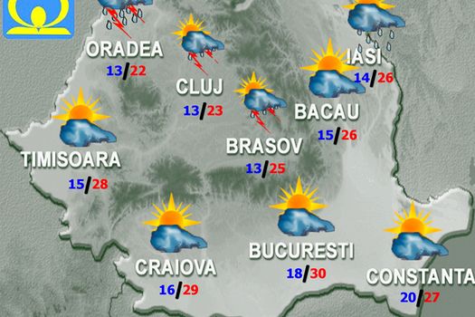 Vremea va fi răcoroasă. În sudul, sud-estul şi centrul ţării, precum şi în zonele de munte vremea va fi în general instabilă şi, mai ales ziua, temporar înnorările vor fi accentuate şi se vor semnala averse, descărcări electrice şi intensificări de scurtă durată ale vântului. Izolat, indeosebi la munte, cantităţile de apă vor fi mai însemnate şi vor fi condiţii de grindină. În restul teritoriului cerul va fi variabil, iar astfel de fenomene vor fi pe arii restrânse.