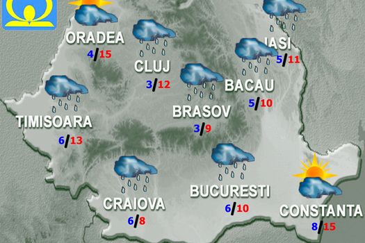 Vremea se va încălzi, astfel încât maximele termice ale zilei se vor situa între 11…12 grade în nordul Moldovei şi în depresiuni şi 20 de grade în Transilvania. Cerul va fi noros în sud-vestul teritoriului, unde temporar va ploua şi cantităţile de apă vor fi însemnate. În celelalte regiuni înnorările vor fi temporare, iar ploile se vor semnala mai ales în cursul zilei, local în Muntenia şi Moldova şi pe arii restrânse în rest. Vântul va avea intensificări în sudul ţării şi la munte, iar trecător şi în regiunile vestice şi centrale. Temperaturile minime vor fi cuprinse între 2 şi 10 grade.