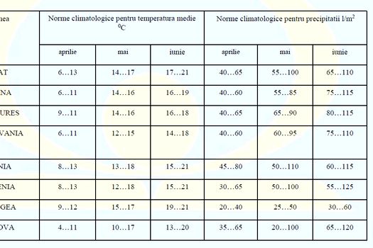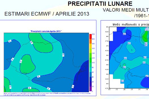 Cantităţile de precipitaţii pot înregistra valori peste mediile multianuale în majoritatea zonelor, iar local în sud-estul, sudul şi vestul ţării precipitaţiile lunare vor fi în limite apropiate de normele climatologice.