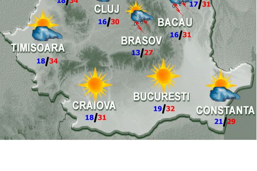 Marţi, vremea se va menţine călduroasă în cea mai mare parte a ţării cu maxime termice ce se vor încadra între 25 de grade în Delta Dunării şi 34 de grade în Campia de Vest şi Lunca Dunării. După-amiaza, în vestul şi sud-vestul teritoriului se va atinge starea de disconfort termic, indicele temperatură-umezeală atingând local pragul critic de 80. Pe parcursul zilei, cerul va fi variabil, cu unele înnorări, ploi de scurtă durată şi descărcări electrice local în zona de munte şi pe arii restranse în centru şi nord-est.