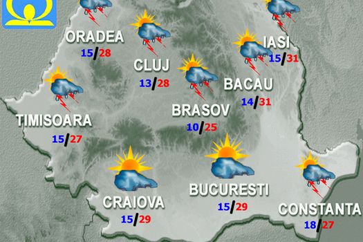Cerul va fi variabil, cu înnorări temporar accentuate mai ales după-amiaza şi la începutul nopţii, când vor fi averse, descărcări electrice şi intensificări de scurtă durată ale vântului pe arii relativ extinse în majoritatea zonelor, exceptând sudul ţării unde astfel de fenomene se vor semnala local. Pe suprafeţe mici vor fi căderi de grindină şi izolat cantităţile de apă vor depăşi 20…25 l/mp. Temperaturile maxime se vor încadra între 23 şi 31 de grade, cu cele mai ridicate valori în regiunile estice. Minimele termice vor fi cuprinse în general între 9 şi 19 grade.