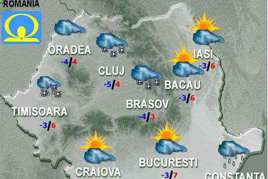 În zona montană local va ninge. Vântul va sufla slab şi moderat, cu unele intensificări în Dobrogea şi pe crestele montane şi doar izolat în rest. Temperatura aerului va avea valori uşor mai mari decât cele normale specifice perioadei, cu maxime cuprinse între 1 grad în estul Transilvaniei şi 9 grade în Oltenia şi minime, în general, între -8 şi 0 grade.