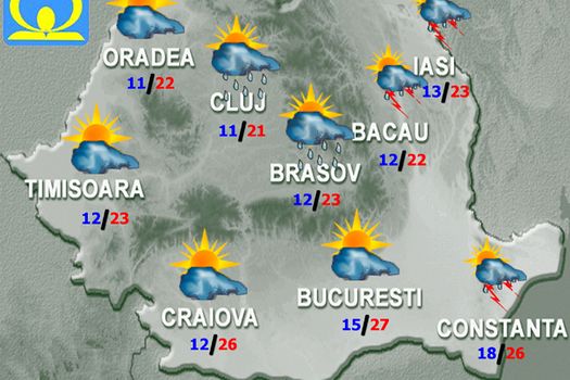 În cursul zilei de vineri vremea va fi predominat frumoasă, cu cer variabil şi valori termice în jurul celor înregistrate în mod obişnuit la această dată. Începând de seara nebulozitatea se va accentua şi vor fi averse ce pot fi însemnate cantitativ, însoţite de descărcări electrice. Vântul va sufla în general moderat. Temperatura maximă va fi de 26…27 de grade, iar cea minimă în jurul a 15 grade.