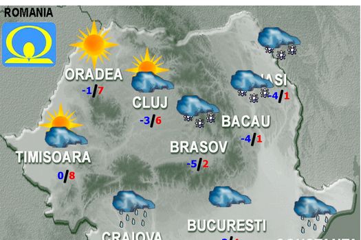 Marţi, vremea va fi în continuare rece pentru această perioadă din an. Cerul va fi temporar noros şi pe arii restrânse vor cădea precipitaţii slabe, sub formă de ninsoare la munte şi în nord şi mixte, în restul teritoriului. Vântul va sufla slab şi moderat, cu unele intensificări la munte, pe litoral şi în sudul Banatului. Temperaturile maxime vor fi cuprinse între -2 şi 7 grade, iar cele minime între -6 şi 1 grad, mai scăzute în estul Transilvaniei. În zonele joase, dimineaţa şi noaptea, se va semnala ceaţă.