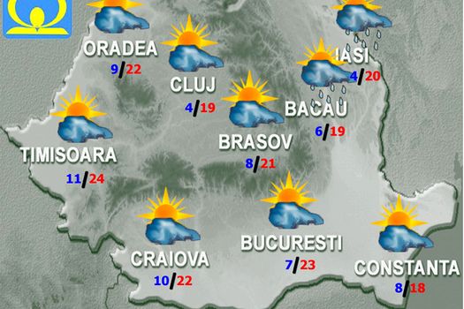 Valorile termice vor continua să crească faţă de ziua anterioară, caracterizând o vreme mai caldă decât în mod normal pentru această dată îndeosebi în vestul, centrul şi sudul teritoriului. Astfel, temperaturile maxime vor fi cuprinse, în general, între 15 şi 24 de grade, iar cele minime se vor încadra între 2 grade în nordul Moldovei şi în jur de 13 grade în Dealurile de Vest. Ziua cerul va fi variabil, cu înnorări temporare în nordul, centrul şi estul ţării şi va ploua slab local în Moldova şi izolat în Maramureş, în estul Transilvaniei, dar posibil şi în Dobrogea şi estul Munteniei. Vântul va avea unele intensificări în est şi pe crestele munţilor. Noaptea nebulozitatea se va accentua treptat în cea mai mare parte a ţării, iar ploi vor cădea pe arii extinse în Oltenia, local în Banat şi Muntenia şi doar izolat în rest. În zona montană înaltă vor fi şi precipitaţii sub formă de lapoviţă şi ninsoare. Vântul va sufla slab şi moderat, cu intensificări la munte şi în jumătatea de sud a ţării unde pe arii restrânse se vor depăşi la rafală 50…55 km/h.