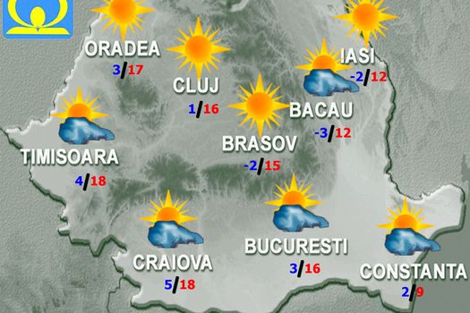 Temperaturile maxime vor fi cuprinse între 8…9 grade pe litoral şi în nordul Moldovei şi 19…20 de grade în Oltenia şi Banat, iar cele minime se vor situa între -3 şi 7 grade, mai scăzute în estul Transilvaniei spre -7 grade. Noaptea, pe arii restrânse în nord, centru şi est se va produce brumă, iar în vest vor fi condiţii de ceaţă.
