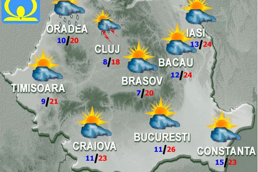 Joi, valorile termice vor marca o creştere în toată ţara, vremea devenind caldă pentru această dată, chiar deosebit de caldă în regiunile sudice, cu maxime între 22 şi 29 de grade, mai ridicate în Câmpia Română. Cerul va fi variabil, cu unele înnorări şi izolat ploi slabe, ziua în nord-est, iar noaptea în vest şi în sud-vest. Vântul va sufla slab şi moderat. Temperaturile minime se vor încadra între 8 şi 18 grade, mai mici în depresiunile intramontane, spre 5 grade.