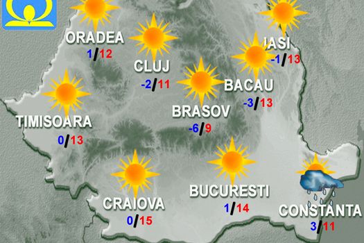 Cerul va fi variabil la senin, cu înnorări în prima parte a zilei în Dobrogea, unde cu totul izolat va ploua slab, iar spre sfârşitul intervalului în regiunile vestice. Vântul va sufla slab şi moderat, cu unele intensificări în estul Dobrogei şi pe crestele montane. Temperaturile maxime se vor încadra între 6 grade în depresiunile Carpaţilor Orientali şi 15 grade în Oltenia şi Muntenia, iar cele minime între -5 şi 5 grade, uşor mai ridicate în Dealurile de Vest, dar şi mai coborâte în depresiuni. Dimineaţa şi noaptea izolat va fi ceaţă şi se va forma brumă.