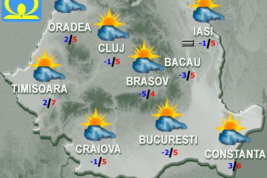 Joi, cerul va avea înnorări. Ziua vor fi condiţii de burniţă, iar noaptea de ceaţă. Vântul va sufla slab până la moderat. Temperatura maximă va fi de 4…5 grade, iar cea minimă de -3…-1 grad.