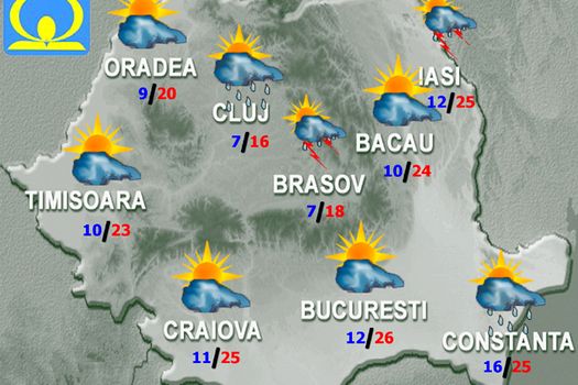 Vremea va fi în general instabilă. Cerul va avea înnorări temporar accentuate şi vor cădea averse, însoţite de descărcări electrice şi de intensificări ale vântului care trecător şi izolat pot lua aspect de vijelie în prima parte a zilei mai ales în vestul, centrul şi nordul ţării, iar după-amiaza şi noaptea local şi în celelalte regiuni. Izolat vor fi căderi de grindină şi cantităţi de apă însemnate. Temperaturile maxime vor fi cuprinse, în general, între 17 şi 27 de grade, iar cele minime se vor situa 6 şi 15 grade, mai ridicate pe litoral.