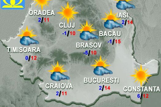Vremea va fi rece dimineaţa şi noaptea, în schimb valorile termice diurne vor fi mai ridicate decât în zilele precedente, apropiindu-se de normalul termic al perioadei. Astfel, temperatura maximă se va situa în jurul valorii de 14 grade, iar cea minimă va fi de 1…3 grade, uşor mai coborâtă în zona preorăşenească. Cerul va fi variabil, iar vântul va sufla slab până la moderat.