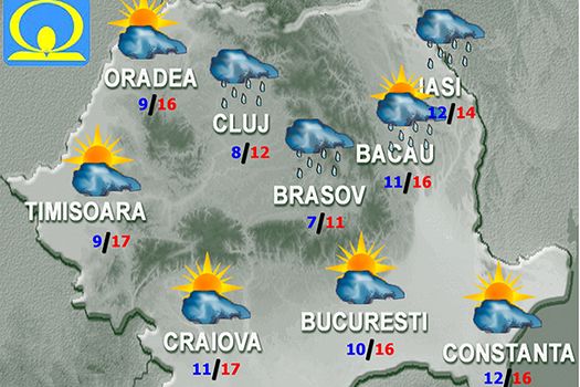 Astfel, temperaturile maxime se vor încadra între 9…10 grade în Maramureş şi Transilvania şi 18 grade în Banat şi Oltenia, iar cele minime vor fi cuprinse între 5 şi 12 grade. Cerul va avea înnorări în majoritatea zonelor şi va ploua local la munte, pe spaţii restrânse în nord şi centru şi izolat în restul teritoriului. Vântul va sufla slab şi moderat, cu intensificări la munte şi local în rest, în special în Oltenia şi nordul Moldovei. Dimineaţa şi noaptea, izolat vor mai fi condiţii de ceaţă.