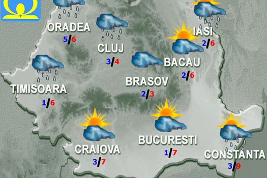Maximele termice vor fi cuprinse între 1 şi 9 grade, iar minimele se vor încadra în general între 0 şi 5 grade. În vestul, nord-vestul şi centrul ţării cerul va fi mai mult noros şi, mai ales în cursul zilei, pe arii extinse vor cădea precipitaţii mixte la munte şi predominant sub formă de ploaie în rest. În Banat şi Crişana izolat se vor cumula cantităţi de peste 15 l/mp. În celelalte regiuni, înnorările vor fi temporare şi se vor semnala izolat ploi slabe. Pe spaţii foarte mici vor mai fi condiţii de producere a poleiului. Vântul va sufla moderat, cu intensificări îndeosebi în sud-vest şi est, unde rafalele vor fi de 45…50 km/h, precum şi la munte, unde pe creste rafalele vor depăşi 70…80 km/h, iar ninsoarea va fi viscolită sau zăpada spulberată, în special în Carpaţii Orientali şi Meridionali.