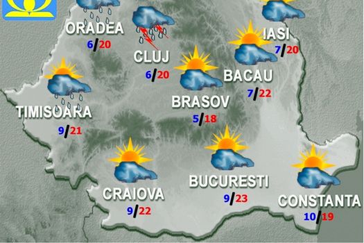 Vremea se va răci accentuat în toată ţara, valorile termice urmând a se situa sub mediile climatologice specifice datei în majoritatea regiunilor. Temperaturile maxime vor fi cuprinse între 10 grade în nord şi 19 grade în sud-vest, iar cele minime se vor situa, în general, între -4 şi 6 grade. Cerul va fi variabil, cu înnorări temporare. În zona montană vor fi precipitaţii slabe, mixte, iar local în sud şi est şi izolat în rest, va ploua. Vântul va sufla slab şi moderat, cu intensificări locale în cursul zilei. Spre dimineaţă în nordul şi centrul ţării, precum şi în dealurile subcarpatice, vor fi condiţii de brumă.