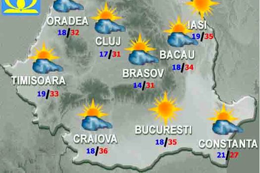 Vremea va fi în continuare călduroasă în cea mai mare parte a ţării, caniculară în sudul Banatului, Oltenia, Muntenia, sudul şi centrul Moldovei, unde şi disconfortul termic va fi ridicat. În restul teritoriului doar izolat indicele temperatură-umezeală (ITU) va atinge pragul critic de 80. În vestul, centrul şi nordul ţării, precum şi în zonele de deal şi de munte, cerul va avea înnorări temporar accentuate şi, mai ales după-amiaza şi seara, pe arii restrânse, vor fi averse, însoţite de descărcări electrice şi de intensificări de scurtă durată ale vântului. Izolat vor fi condiţii de grindină, iar cantităţile de apă pot fi însemnate. În celelalte regiuni, cerul va fi variabil la senin. Temperaturile maxime vor fi cuprinse între 26 de grade pe litoral şi 37 de grade în Lunca Dunării, iar cele minime se vor încadra între 12 şi 22 de grade. Dimineaţa în sud-estul ţării vor fi condiţii de ceaţă.