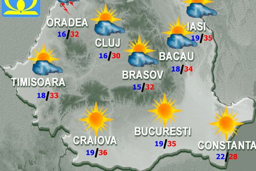 Vremea se va menţine călduroasă în jumătatea de sud-est a ţării, iar în Muntenia, local în Oltenia, sudul Moldovei şi vestul Dobrogei după-amiaza va fi din nou caniculă şi disconfort termic. În restul teritoriului, vremea va fi în general instabilă, cerul va avea înnorări temporar accentuate, pe arii relativ extinse vor fi averse şi descărcări electrice, condiţii în care valorile termice vor fi mult mai scăzute decât în zilele anterioare, apropiindu-se de cele climatologic specifice datei din calendar. Izolat va cădea grindină, iar cantităţile de apă vor depăşi local 25…30 l/mp. Astfel de fenomene îşi vor face apariţia izolat şi în celelalte regiuni, mai ales pe timpul nopţii. Vântul va avea unele intensificări la munte, în zona litoralului, dar cu precădere asociate averselor, când pot lua şi aspect de vijelie. Temperaturile maxime vor fi de la 22…23 de grade în Maramureş şi nordul extrem al Moldovei până la 37…38 de grade local în Muntenia şi sudul Olteniei; minimele termice se vor încadra între 13 şi 23 de grade.