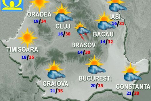 Valul de căldură se va intensifica din nou, astfel că vremea va fi caniculară în orele amiezii şi disconfortul termic accentuat local în zonele de câmpie şi podiş. Cerul va fi variabil la senin, cu înnorări temporar accentuate după-amiaza şi seara în zona de munte, cu precădere a Carpaţilor Meridionali şi a Munţilor Banatului, unde pe arii restrânse vor fi averse, descărcări electrice şi intensificări de scurtă durată ale vântului. În restul teritoriului astfel de fenomene se vor semnala cu totul izolat. Temperaturile maxime vor fi cuprinse, în general, între 28 şi 37 de grade, iar cele minime se vor încadra între 10 grade în depresiunile Carpaţilor Orientali şi 25…26 de grade în Dealurile de Vest.