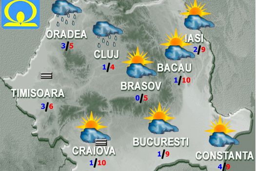 Maximele termice vor fi cuprinse, în general, între 2 şi 12 grade, iar minimele între -3 şi 6 grade. În regiunile vestice, nord-vestice şi centrale norii vor fi persistenţi şi pe arii restrânse vor fi ploi slabe, iar dimineaţa şi noaptea posibil, trecător, şi fulguieli. La munte, cu precădere în Carpaţii Orientali, precipitaţiile vor fi mixte. În restul teritoriului cerul va fi temporar noros. Vântul va sufla slab şi moderat, cu unele intensificări pe crestele montane. Dimineaţa şi noaptea, în zonele joase de relief, local va fi ceaţă, posibil asociată cu burniţă.