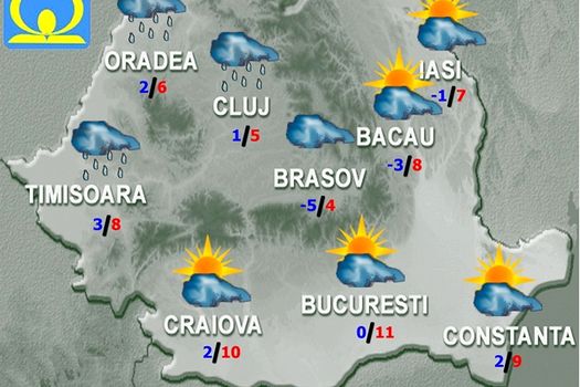 Cerul va avea înnorări temporare în regiunile vestice, nordice şi centrale, unde va ploua pe arii restrânse. Pe timpul nopţii în Maramureş, nordul şi estul Transilvaniei şi nordul Moldovei vor fi precipitaţii mixte. În zona montană izolat va mai ninge. În restul teritoriului cerul va fi variabil, cu înnorări trecătoare şi condiţii pentru ploi izolate în sud-est. Vântul va sufla slab şi moderat, cu intensificări la munte, iar în cursul zilei şi în Moldova, Dobrogea şi sudul Olteniei. Temperaturile maxime se vor încadra între 2 şi 12 grade, iar cele minime între -3 şi 4 grade, mai coborâte în depresiuni, spre -8 grade în cele ale Carpaţilor Orientali. În a doua parte a nopţii se va forma ceaţă local în zonele joase din vestul ţării şi izolat în rest.