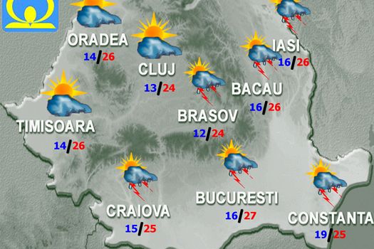 Pe arii restrânse vor fi căderi de grindină, iar cantităţile de apă vor depăşi local 20…25 l/mp şi izolat 40…50 l/mp. În restul teritoriului cerul va fi variabil, cu înnorări trecătoare şi izolat ploi slabe de scurtă durată, însoţite de fenomene electrice. Temperaturile maxime vor fi cuprinse între 21 şi 28 de grade, iar cele minime se vor situa între 9 grade în depresiuni şi 20 de grade în Delta Dunării.