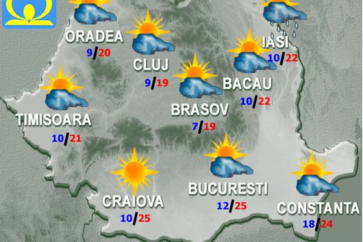Vremea va fi în continuare răcoroasă în vestul şi în nordul ţării, în timp ce în restul teritoriului regimul termic va fi caracterizat de valori în jurul celor obişnuite pentru această dată. Cerul va fi variabil, cu unele înnorări în nordul ţării unde pe arii restrânse va ploua slab, iar noaptea şi în regiunile sudice şi sud-vestice unde pot apărea ploi izolate. Vântul va sufla slab şi moderat, cu intensificări la munte. Temperaturile maxime vor fi cuprinse între 17…18 grade în nordul extrem şi 26…27 de grade în partea sudică a teritoriului; minimele termice se vor încadra între 3…4 grade în depresiuni şi 17…18 grade pe litoral. Dimineaţa şi noaptea, izolat se  va semnala ceaţă.