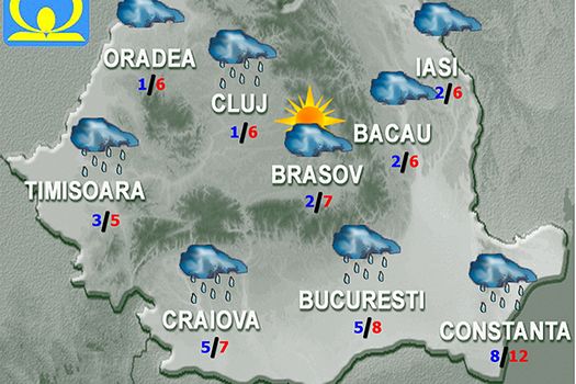 Vremea se va menţine în general închisă, cu un regim termic ce se va situa în jurul normelor caracteristice acestei date, exceptând Dobrogea unde va fi uşor mai ridicat. Cerul va fi noros şi va ploua în cea mai mare parte a ţării, iar în sud şi est se vor cumula cantităţi de apă mai însemnate. În zonele montane se vor semnala precipitaţii sub formă de lapoviţă şi ninsoare, iar în sudul şi estul Transilvaniei, precum şi în Moldova, trecător vor fi precipitaţii mixte. Izolat vor fi condiţii de polei. Vântul va sufla slab şi moderat, cu unele intensificări în sudul ţării şi la munte. Temperaturile maxime se vor încadra între 2 şi 12 grade, uşor mai ridicate în sud-estul extrem; minimele termice vor fi cuprinse între -3 şi 10 grade.