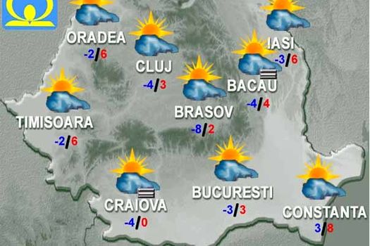 Duminică, vremea va fi apropiată de normalul termic al perioadei în cea mai mare parte a ţării. Cerul va fi variabil, cu înnorări în regiunile sud-vestice şi sudice, însă doar izolat vor fi precipitaţii predominant sub formă de ploaie. Local va fi ceaţă, dimineaţa mai ales în sud, iar noaptea cu precădere în regiunile intracarpatice. Vântul va sufla slab până la moderat, cu unele intensificări la munte. Temperaturile maxime vor fi cuprinse între 2 şi 9 grade, iar cele minime se vor încadra între -7 şi 3 grade, mai scăzute în estul Transilvaniei, spre -11 grade.