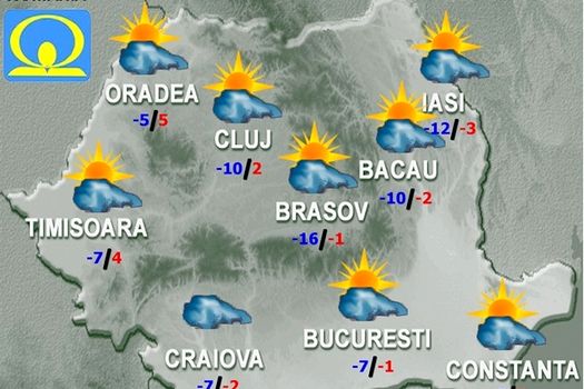 Luni, minimele termice de marţi dimineaţă vor fi cuprinse între -16 şi -6 grade, mai scăzute în depresiunile Carpaţilor Orientali, spre -23 de grade, dar şi mai ridicate în vestul ţării, cu precădere la deal, precum şi pe litoral. Cerul va fi parţial noros în sud şi sud-est, unde doar izolat va fulgui şi variabil la senin în restul teritoriului. Vântul va mai avea unele intensificări, îndeosebi în prima parte a zilei, în sudul Banatului şi la munte, cu rafale de 60…70 km/h şi pe spaţii mici în regiunile sudice şi de răsărit, dar cu viteze ce doar temporar pot atinge 40 km/h. Pe arii restrânse în zonele joase, dimineaţa şi noaptea, va fi ceaţă asociată cu chiciură.