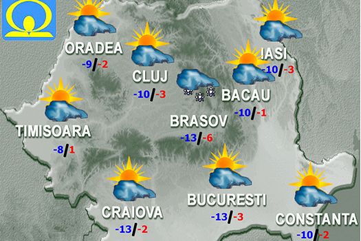 Vremea se va menţine deosebit de rece, geroasă dimineaţa, dar mai ales noaptea. Cerul va fi variabil, cu unele înnorări la începutul zilei, însă condiţiile de fulguială vor fi reduse şi din nou noaptea, când vor fi condiţii de ceaţă asociată cu chiciură. Vântul va sufla slab şi moderat. Temperatura maximă se va situa în jurul valorii de -4 grade, iar cea minimă va fi de -15…-13 grade, mai coborâtă în zona preorăşenească spre -18 grade.