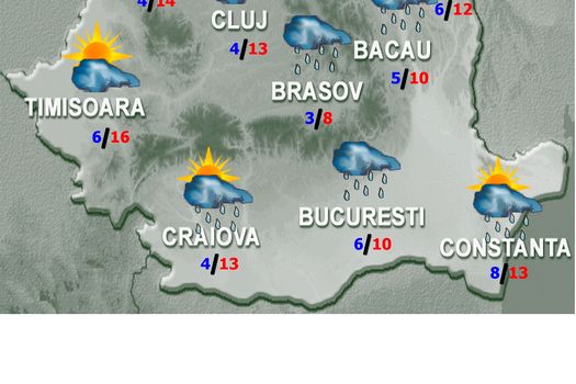 Valorile termice se vor menţine sub cele normale pentru această perioadă, cu precădere în jumătatea de est a teritoriului. În vestul şi nord-vestul ţării vremea se va ameliora ca aspect, cerul va deveni variabil, iar ploile vor fi slabe, pe spaţii tot mai restrânse, doar pe parcursul zilei. În restul teritoriului înnorările vor persista şi va ploua pe arii relativ extinse, iar cantităţile de apă vor fi izolat mai însemnate. La munte precipitaţiile vor fi mixte. Vântul va sufla slab şi moderat, cu unele intensificări pe crestele montane. Temperaturile maxime vor fi cuprinse între 6 grade în Moldova şi în estul Transilvaniei şi 16 grade în Banat, Crişana şi, izolat, în Transilvania, iar cele minime se vor încadra între 1 şi 7 grade. Spre dimineaţă în nordul ţării vor fi condiţii de brumă.