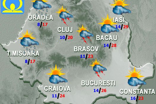 Vremea va fi răcoroasă în vestul, nordul şi centrul ţării, dar în celelalte regiuni va fi caracterizată de un regim termic normal pentru această perioadă. Temperaturile maxime se vor încadra în marea lor majoritate între 14 şi 24 de grade, iar cele minime între 6 şi 16 grade, uşor mai mici în depresiunile din nordul şi centrul ţării. În jumătatea de sud-est a teritoriului vor fi înnorări temporare şi local, mai ales pe parcursul zilei, se vor semnala averse şi descărcări electrice. În restul zonelor cerul va fi variabil, iar astfel de fenomene vor fi posibile izolat. Vântul va sufla slab şi moderat, cu intensificări la munte şi în regiunile estice.