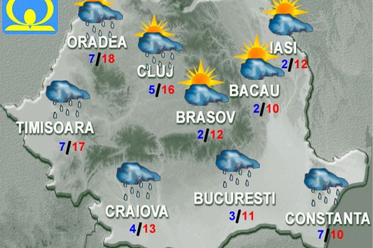 Vremea se va răci accentuat faţă de ziua anterioară, devenind răcoroasă. Temperatura maximă va fi de 10…11 grade, iar cea minimă se va situa în jurul valorii de 3 grade. Cerul va fi mai mult noros şi temporar va ploua. Vântul va avea intensificări, iar la rafală se vor depăşi 55…60 km/h.