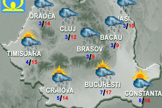 Miercuri, vremea va fi rece pentru această perioadă, cu deosebire în regiunile extracarpatice. Cerul va fi mai mult noros şi pe arii extinse va ploua. Local cantităţile de apă vor depăşi 15 l/mp. La munte şi trecător în Subcarpaţii Moldovei şi în estul Transilvaniei, precipitaţiile vor fi şi sub formă de lapoviţă şi ninsoare. Vântul va sufla moderat, cu intensificări temporare îndeosebi în regiunile sudice şi vestice, precum şi în zona montană. Temperaturile maxime vor fi cuprinse, în general, între 7 şi 15 grade, iar cele minime se vor încadra între 0 şi 8 grade.