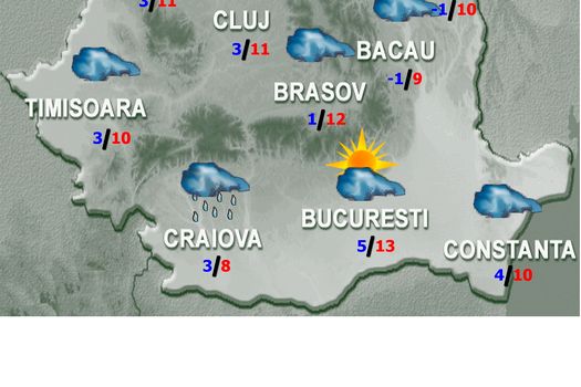 În Bucureşti, luni, vremea va fi rece, astfel încât temperatura maximă va fi de 12…13 grade, iar cea minimă în jur de 4 grade. Cerul va fi temporar noros, iar în cursul zilei vor fi condiţii ca trecător să plouă slab. Vântul va slăbi treptat în intensitate.