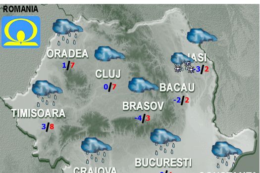 Vremea se va răci în toată ţara. Temperaturile maxime se vor încadra între -3 şi 5 grade, iar cele minime, în general, între -8 şi -2 grade. Cerul va fi mai mult noros, exceptând nord-vestul şi parţial centrul teritoriului unde noaptea va deveni variabil. Se vor semnala precipitaţii slabe, predominant sub formă de ninsoare local în Oltenia şi Moldova şi pe arii restrânse în Muntenia şi Transilvania şi mai ales sub formă de lapoviţă şi ninsoare local în Dobrogea, Banat şi Crişana. La munte vor fi numai ninsori. Vântul va avea intensificări temporare în sudul, sud-estul şi pe arii restrânse în centrul şi nord-vestul ţării, cu viteze la rafală în general de 45…55 km/h, mai mari pe litoral şi pe Clisura Dunării unde vor atinge 60…70 km/h.