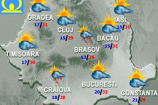 După orele amiezii şi seara, local la deal şi la munte şi izolat în restul teritoriului, iar noaptea, pe arii restrânse în vest şi nord-vest, vor fi înnorări, averse şi descărcări electrice. Punctiform, cantităţile de apă vor fi mai însemnate şi vor fi posibile căderi de grindină. În rest, cerul va fi variabil. Vântul va fi slab şi moderat cu unele intensificări în sud-est şi zona montană înaltă, dar de scurtă durată şi în celelalte regiuni, în timpul ploilor.