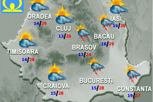 Vremea se va încălzi, astfel încât temperatura maximă va fi de 27…28 de grade. Cerul va fi variabil, cu înnorări temporare mai ales după-amiaza şi seara, când vor fi averse şi descărcări electrice. Vântul va sufla slab şi moderat. Temperatura minimă va fi de 15…16 grade.