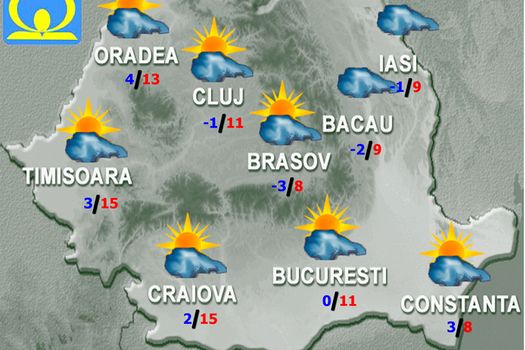 Temperaturile maxime vor fi cuprinse 6 şi 16 grade, iar cele minime se vor situa de la -10…-8 grade în depresiuni, până la 5…6 grade în Dealurile de Vest. Noaptea, în zonele joase vor fi condiţii de ceaţă.