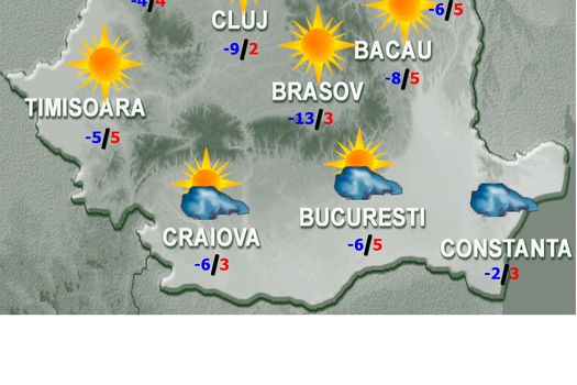 Temperaturile maxime vor fi cuprinse, în general, între -5 şi 5 grade, iar cele minime se vor încadra între -12 şi 0 grade, mai scăzute în depresiuni spre -20 de grade. Dimineaţa şi noaptea, în zonele joase de relief, izolat se va semnala ceaţă.
