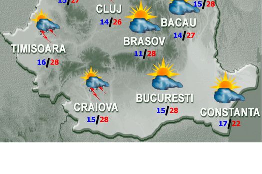 Ploile pot avea şi caracter torenţial, iar cantităţile de apă vor depăşi izolat 25 l/mp şi vor fi condiţii de grindină. În restul teritoriului cerul va fi variabil, cu înnorări în partea a doua a intervalului în Moldova şi Muntenia, unde astfel de fenomene se vor semnala local. Minimele termice se vor încadra între 7 şi 17 grade.