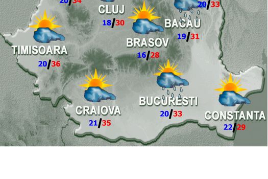 Temperaturile maxime se vor incadra in general intre 28 si 37 de grade. Cerul va fi variabil, cu innorări temporar accentuate după-amiaza si seara in estul teritoriului, precum si in zonele de deal si de munte, iar noaptea in jumătatea de vest, unde local vor fi averse, descărcări electrice si intensificări de scurtă durată ale vantului, ce pot lua si aspect de vijelie. Izolat vor fi căderi de grindină si cantităti de apă de peste 25 l/mp. In restul teritoriului astfel de fenomene se vor semnala pe arii mai restranse. Minimele termice se vor situa intre 14 si 24 de grade.