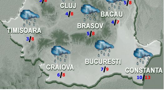 În restul teritoriului ploile vor fi locale şi în general slabe cantitativ. La munte, ziua vor predomina ploile, iar noaptea, treptat se vor transforma în lapoviţă şi ninsoare. Spre sfârşitul intervalului, precipitaţii slabe, mixte vor fi posibile şi în zonele deluroase din nord-vest şi centru. Vântul va sufla slab şi moderat, cu unele intensificări în zona montană înaltă. Temperaturile maxime se vor încadra între 5 şi 13 grade, iar cele minime între 0 şi 10 grade.