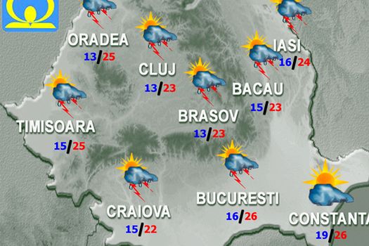 Joi, vremea va fi în continuare instabilă îndeosebi în jumătatea sudică a ţării, unde mai ales după-amiaza şi la începutul nopţii pe arii extinse vor fi averse, descărcări electrice şi intensificări de scurtă durată ale vântului. Vor fi condiţii de grindină, iar local cantităţile de apă vor fi mai însemnate. În restul teritoriului cerul va fi temporar noros şi local se vor semnala fenomene specifice instabilităţii atmosferice. Temperaturile maxime vor fi cuprinse între 22 şi 28 de grade, iar cele minime se vor situa între 8 grade în depresiuni şi 20 de grade în Delta Dunării.