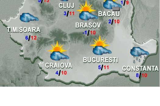 Valorile termice diurne vor continua să caracterizeze o vreme mai rece decât în mod obişnuit pentru această perioadă din an, îndeosebi în sudul, în centrul şi în estul teritoriului. Cerul va avea înnorări în majoritatea zonelor. Va ploua slab, local în vestul şi sud-vestul ţării, iar în rest izolat vor fi posibile ploi slabe sau burniţă. La munte, precipitaţiile vor fi şi sub formă de lapoviţă şi ninsoare. Vântul va sufla slab şi moderat, cu unele intensificări în sudul Banatului şi pe crestele montane. Temperaturile maxime se vor încadra între 7 şi 14 grade, iar cele minime între -3 grade în depresiunile Carpaţilor Orientali şi 9…11 grade pe litoral. Pe arii restrânse vor fi condiţii de ceaţă.