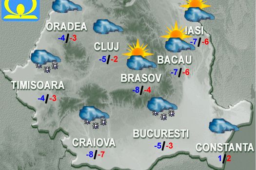 Cerul va fi mai mult noros. Ziua va ninge mai ales în Oltenia şi Muntenia, dar începând de seara ninsorile se vor extinde şi în restul teritoriului. Spre sfârşitul nopţii în estul Munteniei şi în Dobrogea izolat precipitaţiile pot fi şi sub formă de lapoviţă sau ploaie, favorizând depunerile de polei. Vântul va avea unele intensificări îndeosebi în nord-estul ţării şi la munte. Temperaturile maxime vor fi cuprinse între -10 şi 2 grade, iar cele minime se vor situa între -12 grade în depresiuni şi 1 grad pe litoral.