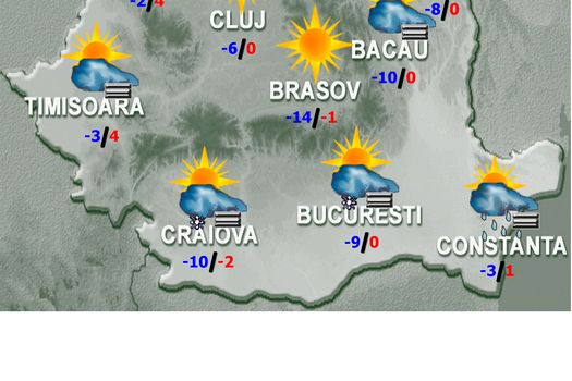 În cursul zilei, cerul va fi variabil, cu înnorări mai ales în sudul şi estul ţării, unde izolat se vor semnala fulguieli sau burniţe, favorizând depunerile de polei. Noaptea, înnorările vor fi mai accentuate în regiunile vestice şi nord-vestice, unde pe arii restrânse vor cădea precipitaţii mixte şi se va depune polei. Vântul va sufla slab şi moderat, cu unele intensificări în Banat şi Moldova. Temperaturile maxime se vor încadra între -4 grade în Oltenia şi estul Transilvaniei şi 6 grade în Dealurile de Vest, iar cele minime vor fi cuprinse între -13 şi 0 grade, mai scăzute în depresiunile Carpaţilor Orientali, până spre -18 grade. Îndeosebi dimineaţa şi noaptea, în zonele joase se va semnala ceaţă, asociată cu depunere de chiciură.