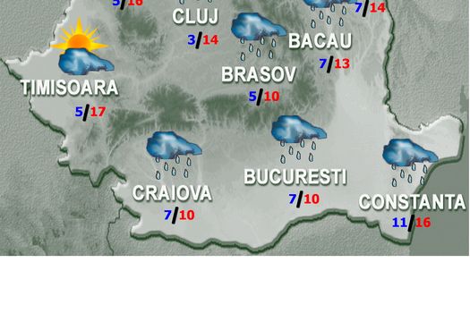 Vântul va avea intensificări în regiunile sudice cu viteze la rafală de 45…55 km/h, local peste 60 km/h în sud-est, iar în Dobrogea va suflă tare, cu peste 80…90 km/h. În restul teritoriului cerul va avea înnorări temporare, iar ploile vor fi izolate. Temperaturile maxime se vor încadra între 8 şi 17 grade, cu cele mai ridicate valori în Câmpia de Vest; minimele termice vor fi cuprinse 1 şi 11 grade. Izolat vor fi condiţii de ceaţă şi, mai ales în nord şi centru, se va produce brumă.