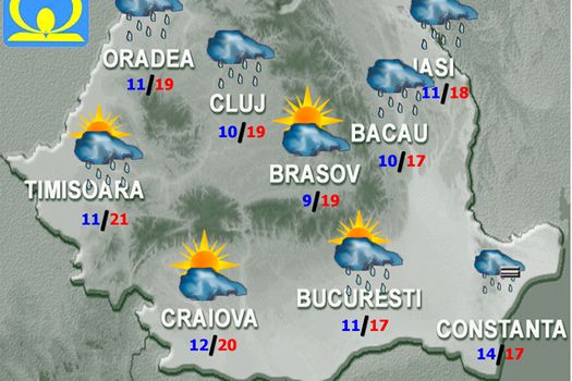 Miercuri, cerul va fi temporar noros şi va ploua slab, local în jumătatea de nord a ţării şi izolat în rest. La munte, precipitaţiile vor fi şi sub formă de lapoviţă şi ninsoare. Vântul va avea intensificări mai ales în sudul, estul şi centrul teritoriului, iar în zona montană va fi tare. Temperaturile maxime se vor încadra între 11 şi 20 de grade, iar cele minime între 2 şi 10 grade.